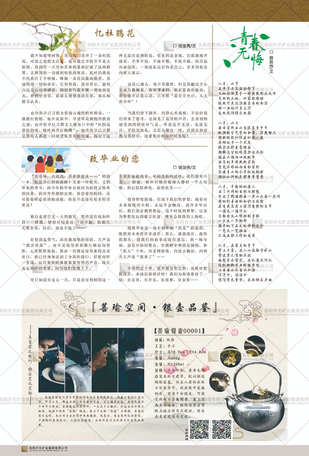 洛陽開元礦業(yè)集團有限公司簡介洛陽開元礦業(yè)集團有限公司,始成立于2006年,位于洛陽市開元大道269號。集團旗下共有五余家全資子公司,業(yè)務(wù)涉及有色金屬礦山開發(fā)、礦產(chǎn)品購銷與進出口貿(mào)易、房地產(chǎn)開發(fā)、文化藝術(shù)、企業(yè)管理與咨詢、資本投資等多個領(lǐng)域。民建河南省委委員、民建河南省委企業(yè)委副主任、民建洛陽市委委員、企業(yè)委主任、洛陽民建企業(yè)家協(xié)會會長許明月是公司創(chuàng)始人,現(xiàn)任洛陽開元礦業(yè)集團有限公司董事長。在礦業(yè)領(lǐng)域,洛陽開元礦業(yè)集團擁有多家實力雄厚的子公司:貴州開元礦業(yè)有限公司探、采礦權(quán)面積共11.33平方公里;興??h銅鑫礦業(yè)有限公司探礦權(quán)面積8.76平方公里,礦山資源潛力巨大;2021年,開元集團與盧氏中科礦業(yè)有限公司開展戰(zhàn)略合作。盧氏中科礦業(yè)有限公司專注于有色金屬的浮選、加工和銷售,擁有強大的技術(shù)支撐平臺,是集探、采、選、冶、研為一體的中大型綜合礦業(yè)企業(yè)。目前,盧氏中科王家河1000噸選礦廠已成功投產(chǎn),雙河金礦、柳關(guān)欒盧鉛鋅礦相繼順利開工,樓房銀礦與圪老灣鉛鋅礦的深部探礦重大突破,標志著礦山版圖取得重大進展,為開元集團后續(xù)發(fā)展奠定了堅實基礎(chǔ)。在文化傳媒領(lǐng)域,洛陽市明月美術(shù)館通過豐富多樣的藝術(shù)展覽、學術(shù)研討和公共教育活動,努力打造一個集展覽、交流、教育、研究為一體的綜合性藝術(shù)平臺。此外,在金融投資領(lǐng)域,開元集團旗下的北京明峰資本管理有限公司專注于投資具有高增長潛力的優(yōu)秀企業(yè),特別是高科技、新能源、環(huán)保等新興產(chǎn)業(yè),為客戶提供個性化的資產(chǎn)配置服務(wù)。在做好企業(yè)經(jīng)營的同時,開元集團始終不忘企業(yè)的社會責任和家國情懷,以突出的愛心公益事跡,開展了一系列公益慈善活動:“民建林”公益事業(yè)通過“思源基金”“幫幫公益”線上公益平臺,與眾多愛心人士籌措資金20余萬元;資助541名貧困大學生共計270余萬元,推進“數(shù)字助力——河南AI人才培養(yǎng)”;捐款10萬元,馳援京津冀、黑龍江洪水地質(zhì)災(zāi)害……公司于2017年底被洛陽市慈善總會評為“洛陽慈善風云榜——十大愛心集體”。洛陽開元礦業(yè)集團有限公司秉承持續(xù)發(fā)展理念,憑借多年來良好的企業(yè)信譽與經(jīng)營業(yè)績,與全國多家企業(yè)建立了良好合作關(guān)系,受到社會各界的一致好評,多次榮獲“納稅標兵”“先進企業(yè)”“招商引資模范企業(yè)”等榮譽稱號。回望來時路,開元人勠力同心,以“闖”的精神和“創(chuàng)”的勁頭,一路披荊斬棘,踏過千山萬水;展望新未來,開元人凝心聚力,不執(zhí)于“舊”,無畏于“新”,秉承“勇于跨越,追求卓越”的企業(yè)精神,乘著國家高質(zhì)量發(fā)展新征程的東風,跨過高山,越過大海,向著集團多元化、國際化的目標,逐夢遠航,跨越前行!